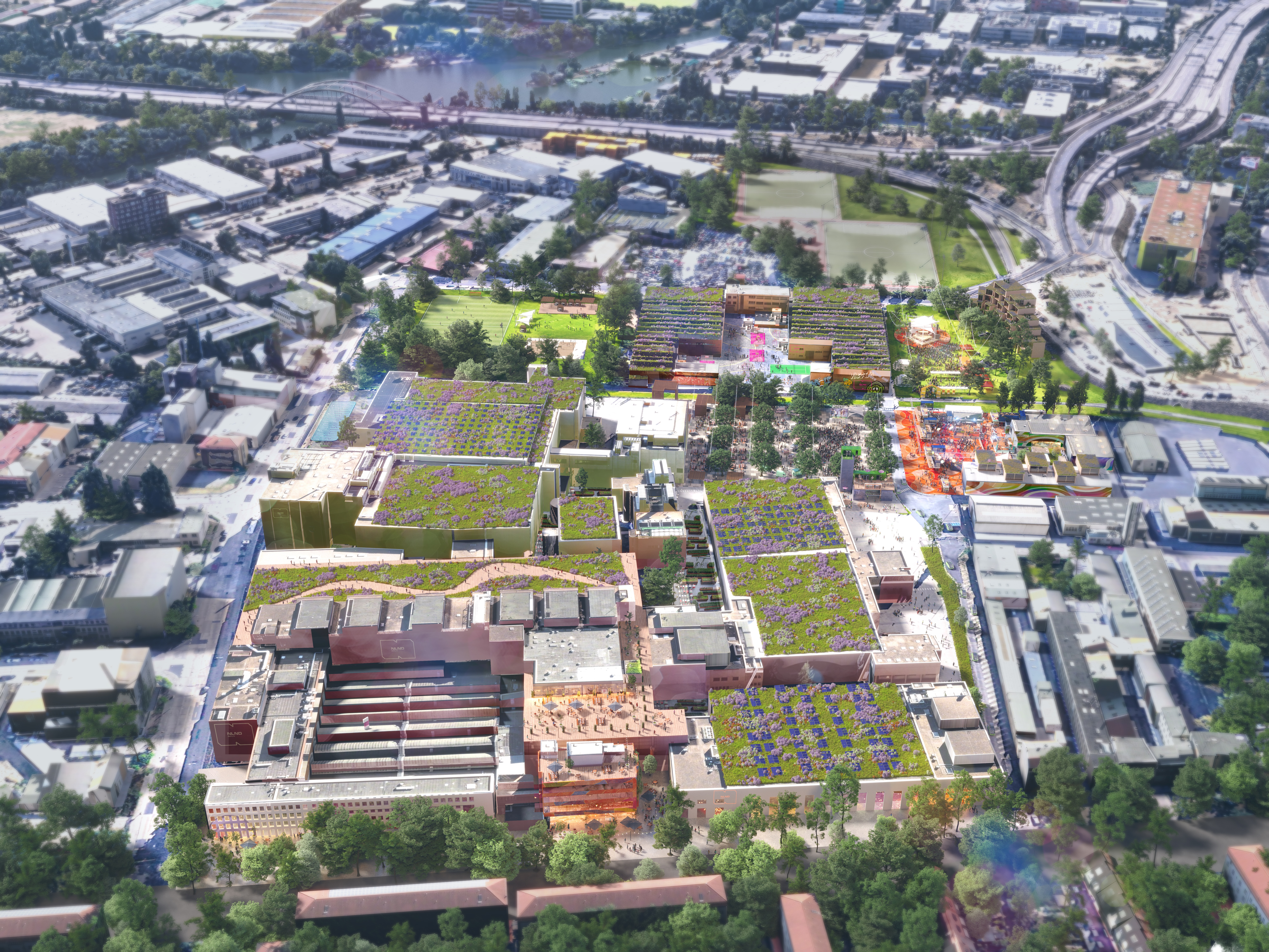 Spanning 150,000m² (30 buildings), the NLND Campus offers private production and office spaces, a makers lab, and tenant facilities—surrounded by public restaurants, cafés, cultural venues, and sports facilities.