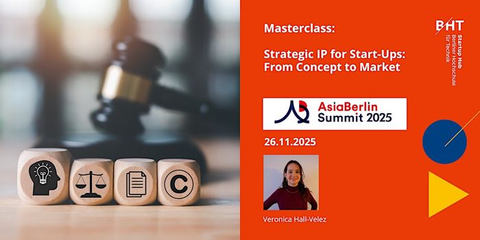 Protect, leverage, and scale your innovations. Join us at the AsiaBerlin Summit 2025 Satellite Event at the Berliner Hochschule für Technik at Haus Gauß B501 (Senatsaal) for a practical and business-focused introduction to Intellectual Property (IP) law designed for start-ups and innovators. This session will provide a clear understanding of patents, trademarks, designs, and copyright—and show how to use IP as a strategic asset to secure investment, strengthen market positioning, and support expansion across borders.